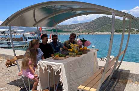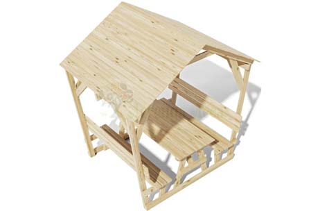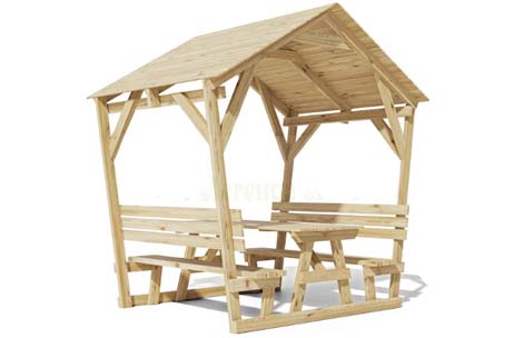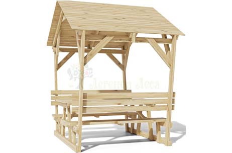 Беседка оснащена удобными лавочками и столом из экологичной обрезной доски.