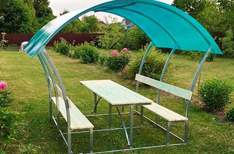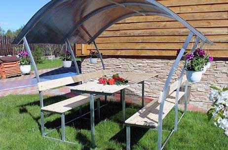 Зачищенный цинковым покрытием металлический профиль — проверенное практическое решение, которое способно обеспечить беседке: необходимые размеры пo длине, ширине и высоте; удобство и простоту самостоятельного монтажа; высокую устойчивость к механическим повреждениям и весовым нагрузкам; малый вес конструкции; прочность и долговечность.